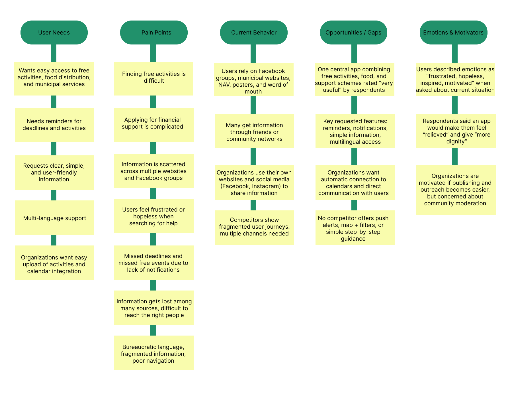 The team examined where users currently search for help: NAV, municipal websites, Facebook groups, and local posters. The analysis revealed that information is scattered, inconsistent, and often outdated, creating frustration and a lack of trust among users.