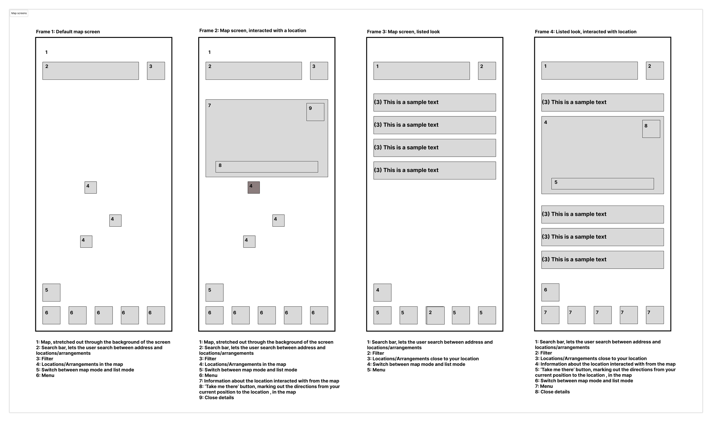 A central focus during this phase was to reduce cognitive load for users who often find themselves in stressful or vulnerable situations. Because of this, we worked with large, clear navigation elements, limited choices per screen, and an information structure that prioritised clarity and a sense of safety over complexity. We sketched how users would move from a simple starting point, gain an overview of relevant categories, and navigate into lists and detailed views without encountering unnecessary barriers.