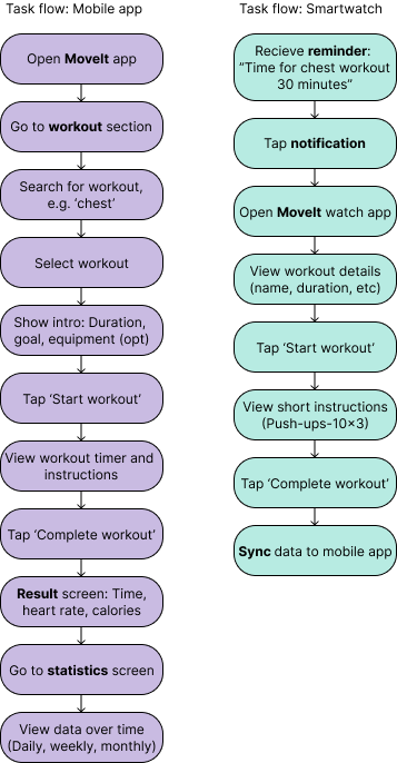 The task flow shows the specific steps Jarno must go through to start and complete a workout session in the MoveIt app. This linear process focuses on the core task and assumes that Jarno already knows what he wants to do. It only includes the necessary screens and actions that lead him to the goal without distractions.