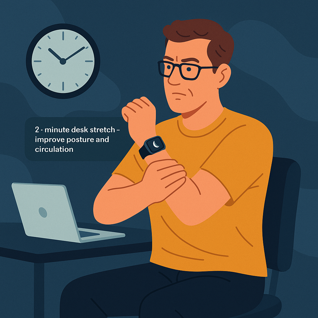 He taps Start, and the watch guides him through simple, seated movements he can complete without leaving his desk. After finishing the short routine, he feels clearer and more energized and proud that he managed to do something for his health despite his tight schedule